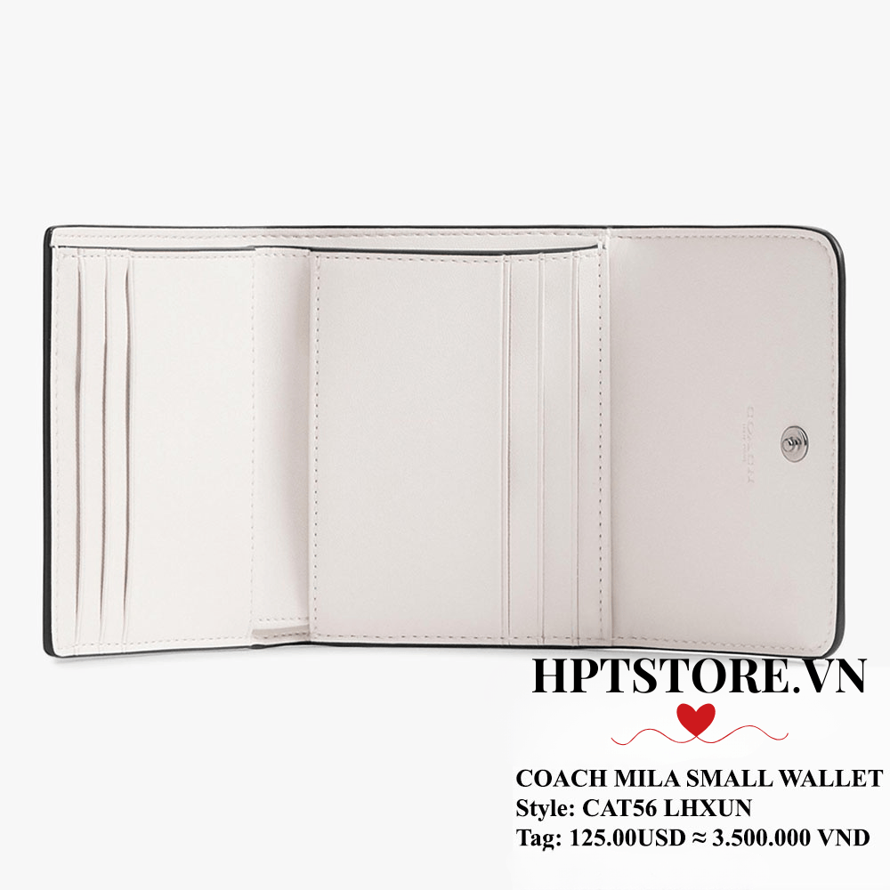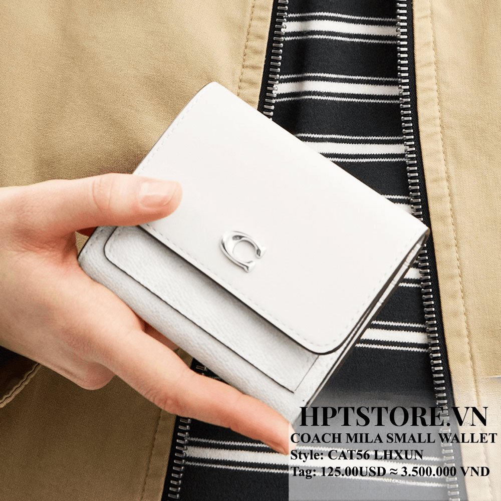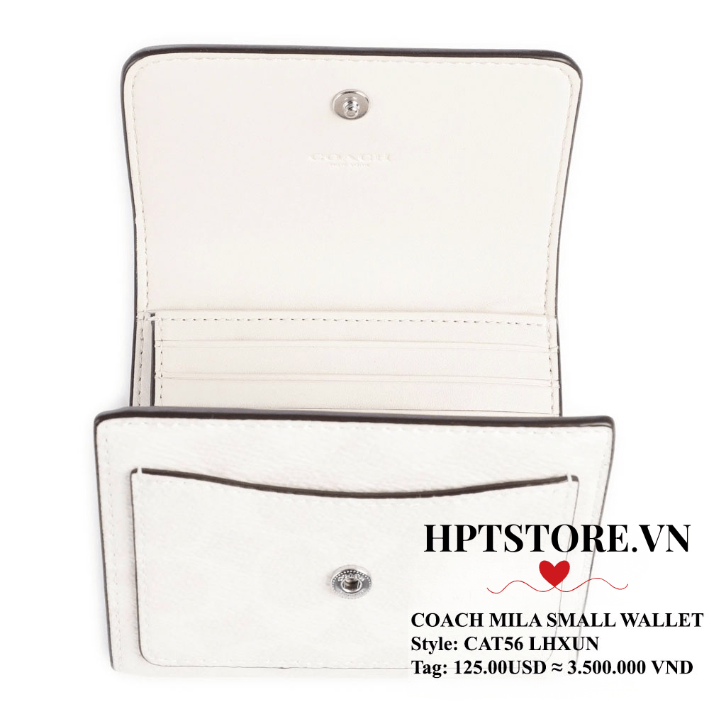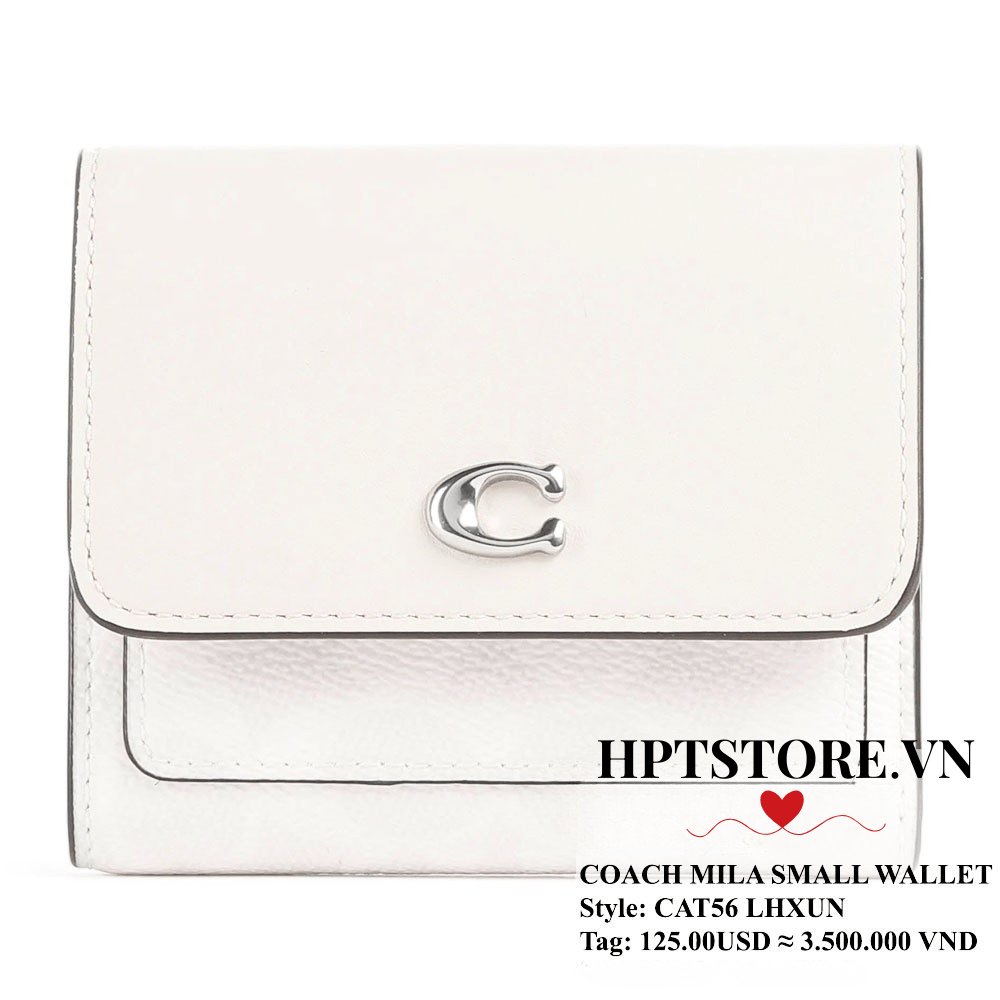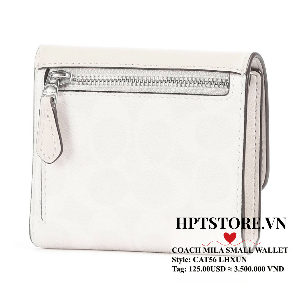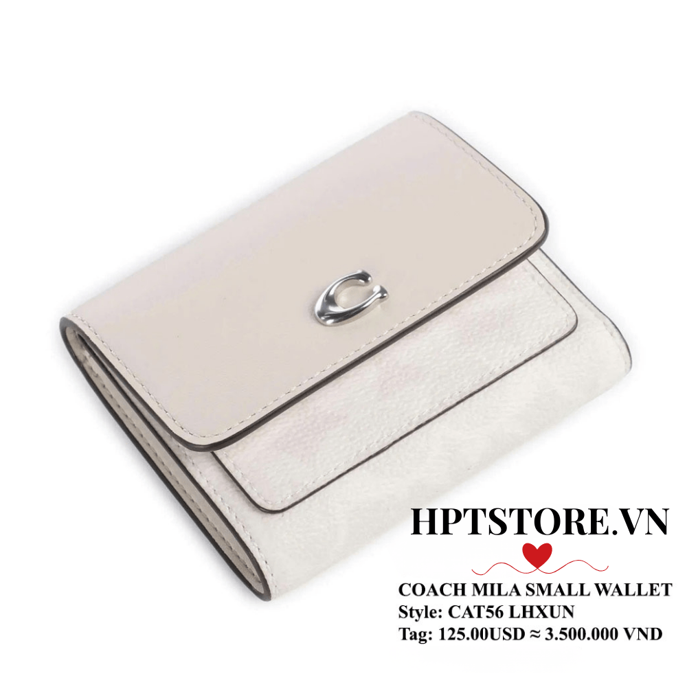 Ví Coach Mila Small Flap Wallet (CAT56) là lựa chọn hoàn hảo cho nàng yêu sự gọn gàng, sang trọng. Thiết kế gập nhỏ xinh, tone Chalk Ivory dễ phối đồ, kết hợp họa tiết Signature Canvas và điểm nhấn hardware chữ C đặc trưng mang đến vẻ thanh lịch đậm chất Coach.